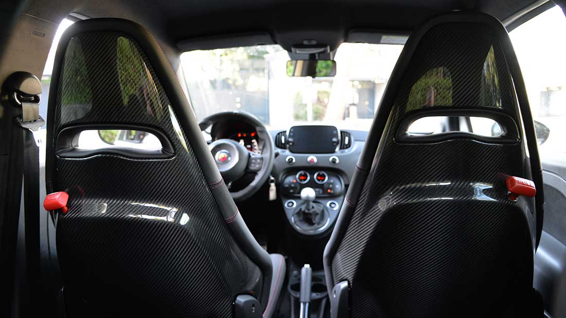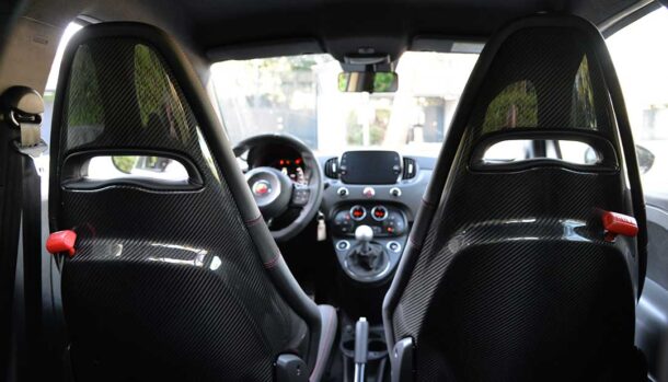 Nell’abitacolo tanti i particolari realizzati in materiale composito, dai particolari di plancia, console centrale e volante fino ai bellissimi sedili sportivi con guscio in fibra di carbonio, l’aria che si respira è quella di una vettura di chiara impostazione sportiva.