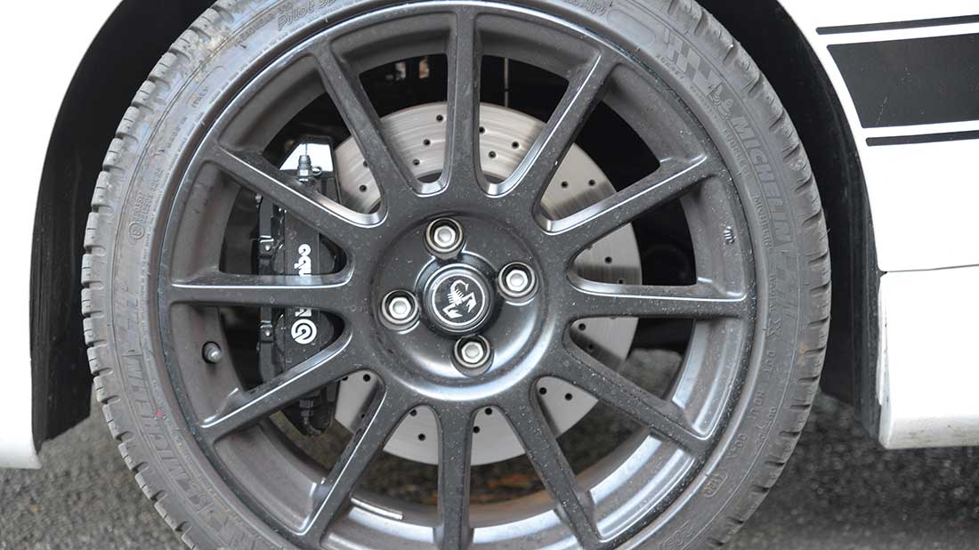 La Scorpioncina si avvale di una componentistica di pregio, le pinze freno sono della Brembo e mordono dischi anteriori da 305 mm e posteriori da 204 mm, i sedili con guscio in carbonio sono della Sabelt, a richiesta è possibile optare per la presenza del differenziale autobloccante, per un grip a prova di errore.