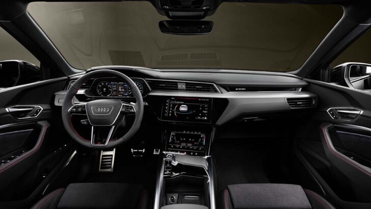 La sezione superiore della plancia è in similpelle nera, mentre un ulteriore tocco d’esclusività è garantito dal pacchetto cuciture in rosso a contrasto, di derivazione Audi Sport, esteso alle sedute, alla corona del volante, alle protezioni per le ginocchia lungo la console e ai braccioli laterali.