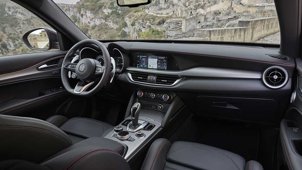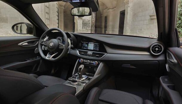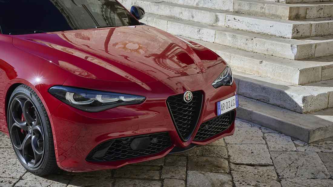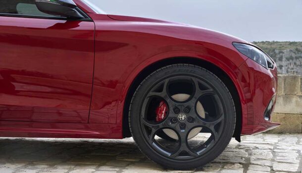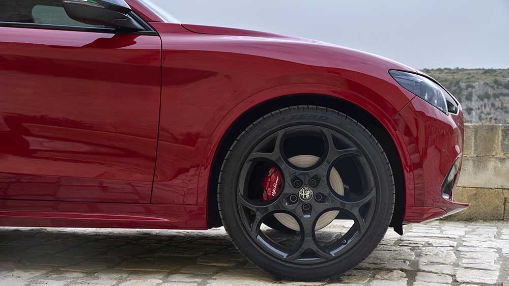 Ad arricchire la carrozzeria diversi gli elementi distintivi, dalla griglia frontale con inserto V (nera per Giulia e Stelvio mentre sulla Tonale è in Dark Miron) ai cerchi da 21 pollici per Stelvio, 19” per Giulia e 20” per Tonale, tutti abbinate alle sportivissime pinze freno rosse della Brembo.