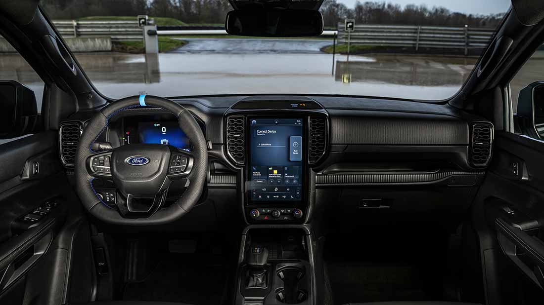 Il look del Ford Ranger MS-RT viene esaltato da esclusivi cerchi diamantati da 21 pollici, con pneumatici 275/45 R21 a basso profilo. I passaruota maggiorati estendono la larghezza complessiva del veicolo di 82 mm sia all’anteriore che al posteriore. La carreggiata è aumentata di 40 mm su ciascun lato per migliorare l’aderenza e la stabilità. Uno speciale assetto è stato messo a punto per raggiungere il livello perfetto di maneggevolezza e comfort. Gli interni, a doppia cabina, hanno ricevuto lo stesso aggiornamento in direzione racing. Sia i sedili anteriori, dotati di supporto laterale, sia quelli posteriori, sono in foggia sportiva. Con eleganti rivestimenti di origine non animale, con impunture blu e ricami MS-RT. Il volante sportivo, squadrato e riscaldabile, ha un indicatore blu posizionato a ore 12, come sulle auto da corsa.