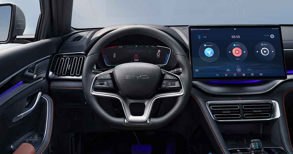 Il BYD SEAL U DM-i utilizza il linguaggio di design “Ocean Aesthetics”. Si ispira ai contorni aggraziati e al movimento dell’oceano. È caratterizzato da un frontale distintivo a forma di X. E da un paraurti anteriore con fari a LED integrati a doppie lenti che conferiscono al veicolo un senso di potenza e stabilità. La linea di cintura dinamica e le proporzioni equilibrate della carrozzeria proiettano una silhouette elegante e slanciata. Al posteriore, i fari a LED con barra luminosa a tutta larghezza accentuano l’aura high-tech della vettura. Gli interni moderni hanno un’impronta premium e creano un’oasi di tecnologia. I rivestimenti in pelle vegana di alta qualità offrono raffinatezza e comfort. I sedili regolabili sono dotati di poggiatesta anteriori e posteriori integrati. La console centrale “Ocean-heart” e il selettore del cambio in cristallo sono dotati di un touchscreen full LCD da 15”6 ruotabile. Il BYD SEAL U DM-i offre standard di sicurezza con un corredo di ADAS.