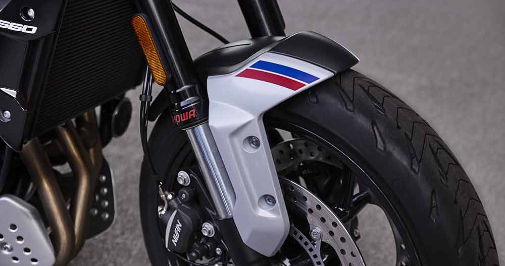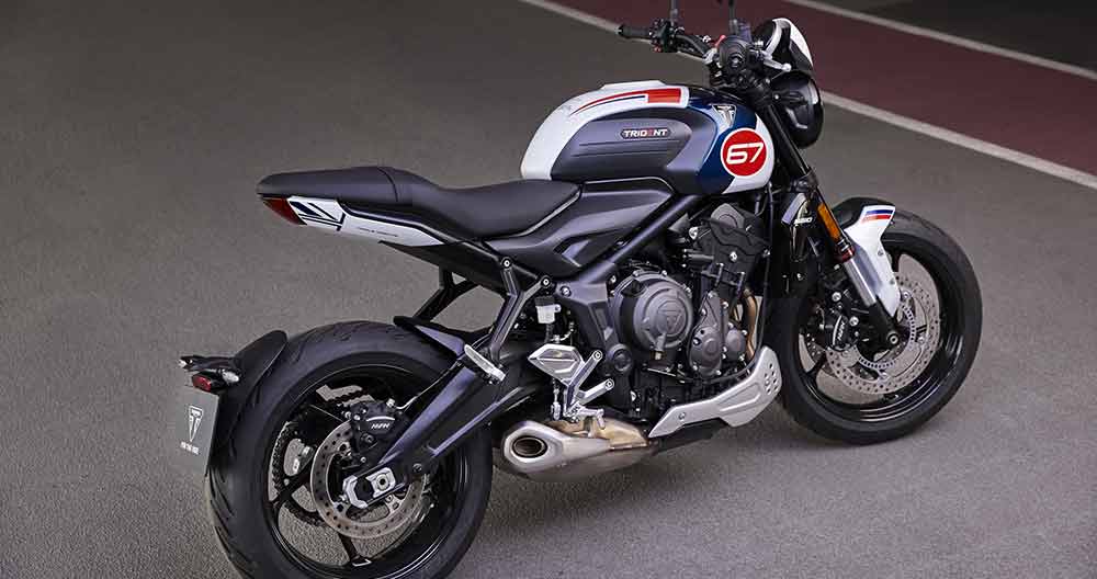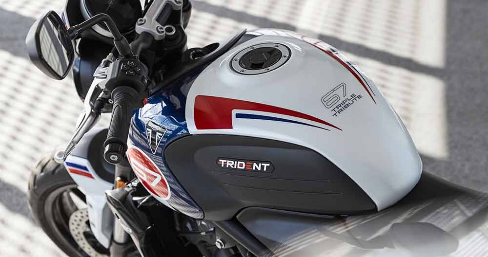 La Triumph Trident Triple Tribute è un’edizione speciale caratterizzata da grafiche sportive e contemporanee. Ricordano l’iconica colorazione racing Triumph in bianco, blu e rosso.
