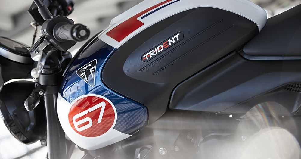Triumph Motorcycles presenta la nuova Trident 660 Triple Tribute, un’edizione speciale caratterizzata da grafiche sportive e contemporanee. Disponibile solo per un anno, presenta un nuovo schema grafico distintivo che si ispira a “Slippery Sam”, la Trident che ha scritto pagina gloriose della storia racing del Brand Britannico. La livrea in bianco, blu e rosso, con cupolino e puntale in tinta, si distingue per le sue linee pulite e minimali. L’inconfondibile design del serbatoio presenta una grafica di ispirazione racing e il numero 67 attorno ai caratteristici spazi per le ginocchia, adattandosi alle linee fluide della sella. Con un’attenzione impeccabile ai dettagli, la nuova Trident 660 presenta il badge Triumph sia sul faro anteriore sia sul fanale posteriore. Con alcuni rimandi al logo su tappo del serbatoio, morsetto del manubrio e sulla strumentazione. Oltre al badge Trident in alluminio con dettagli lavorati a diamante. I fianchetti del radiatore presentano le stesse colorazioni della livrea. Il look viene completato dalle barre e i paratacchi in alluminio, le protezioni della forcella, il manubrio e gli iconici specchietti a goccia.