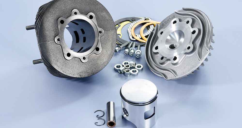 Il kit Evolution con immissione a valvola rotante si monta su tutti i tipi di Vespa 125 con albero motore di misura uguale all’originale. È disponibile anche un albero motore Polini codice 210.0033 con biella ricavata dal pieno, anticipato e bilanciato per essere montato mantenendo la corsa originale da 51mm. Oltre al collettore originale è possibile montare i collettori Polini da 2 o 3 fori in base al proprio carter. Inoltre è stato appositamente sviluppato un collettore per essere abbinato ai carburatori Polini PWK disponibili nelle misure 24/26/28. Per ottenere il massimo delle prestazioni è consigliato il montaggio con la marmitta Polini For Race codice 200.0424. Il cilindro è fuso in ghisa, con alesaggio diametro 58mm. Diagramma di distribuzione molto “racing”. Sei luci di travaso. Il pistone, fuso per gravità in lega leggera, è provvisto di due segmenti in ghisa S10 cromati. La testa è fusa in un unico pezzo e per aumentare la dissipazione del calore sono state create delle alette aggiuntive anche sotto il piano della testa. Il rapporto di compressione è disegnato per ottenere il massimo della prestazione.