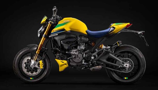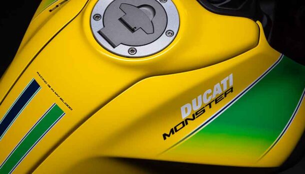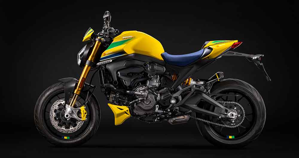 Anche il numero limitato di esemplari è un tributo alla leggenda: 341. 3, come i Titoli Mondiali conquistati da Senna in Formula 1 e 41, come i Gran Premi che Ayrton concluse a braccia alzate sul gradino più alto del podio. Il Monster, reinterpretazione in chiave moderna della ricetta originale, è una moto leggera, facile, maneggevole e veloce. È spinto dal motore Testastretta 11°, un bicilindrico 4 valvole raffreddato a liquido con distribuzione desmodromica da 111 cavalli, affidabile e divertente grazie a una curva di erogazione piena a tutti i regimi. È dotato di una ciclistica estremamente razionale ed efficace ispirata alle Superbike Ducati. Sospensioni Öhlins completamente regolabili e sportive, cerchi forgiati, impianto frenante con pinze anteriori Brembo Stylema. Flange in alluminio per i dischi freno e un’elettronica ai vertici del segmento. L’estetica del Monster Senna, oltre alla speciale colorazione, è impreziosita dai tag giallo/verde/blu sui cerchi neri, e dai dettagli in giallo riportati sulle pinze freno e sui silenziatori omologati Termignoni, in fibra di carbonio. Altri elementi distintivi di questo modello sono la sella speciale, il puntale paramotore in tinta e l’animazione dedicata del dashboard. Ogni moto è infine resa unica da una placca sulla piastra di sterzo con riportato nome del modello e numero dell’esemplare. Oltre che dalla consegna del certificato di autenticità e del telo coprimoto dedicato.