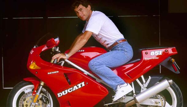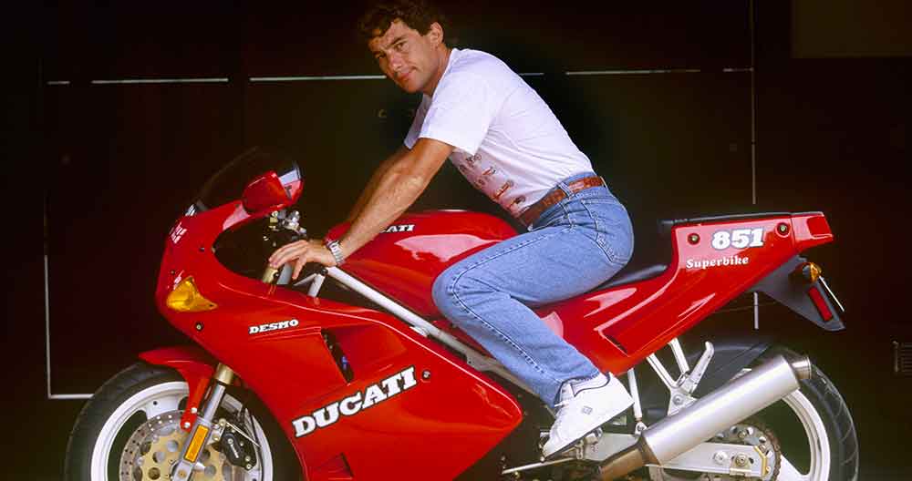 Ducati e Senna, hanno da sempre avuto una reciproca attenzione. Senna fu uno dei primissimi proprietari del Monster 900, moto utilizzata per i suoi spostamenti cittadini a Montecarlo e in sella al quale si presentò alla serata di gala per la presentazione del Gran Premio di Monaco del 1993. Del Monster ad Ayrton piaceva quel concetto semplice di voler portare il divertimento nella guida al centro dell’esperienza motociclistica. Un motore sportivo, perfetto per l’uso stradale, ciclistica derivata dalla Superbike, manubrio largo e niente carenatura. Le strade di Ducati e di Ayrton Senna si incrociarono per la prima volta nel 1990, quando Claudio Castiglioni, allora proprietario di Ducati e appassionato fan di Senna e del suo innato talento, regalò al tre volte iridato una 851 SP. Negli anni successivi Senna e Ducati capirono di avere parecchi valori in comune. Quando il Campione del Mondo vide dal vivo la nuova Ducati 916, ne rimase assolutamente affascinato. Dando il via all’idea di una collaborazione su un progetto speciale in grado di unire due marchi: Ducati e Senna. Nacque così la Ducati 916 Senna, una moto di cui il pilota brasiliano scelse personalmente la livrea, optando per una grafica a contrasto tra grigio antracite, nero opaco e rosso, che negli anni seguenti diventò iconica. La serie speciale, limitata a soli 300 esemplari, venne annunciata da Ducati a marzo del 1994.