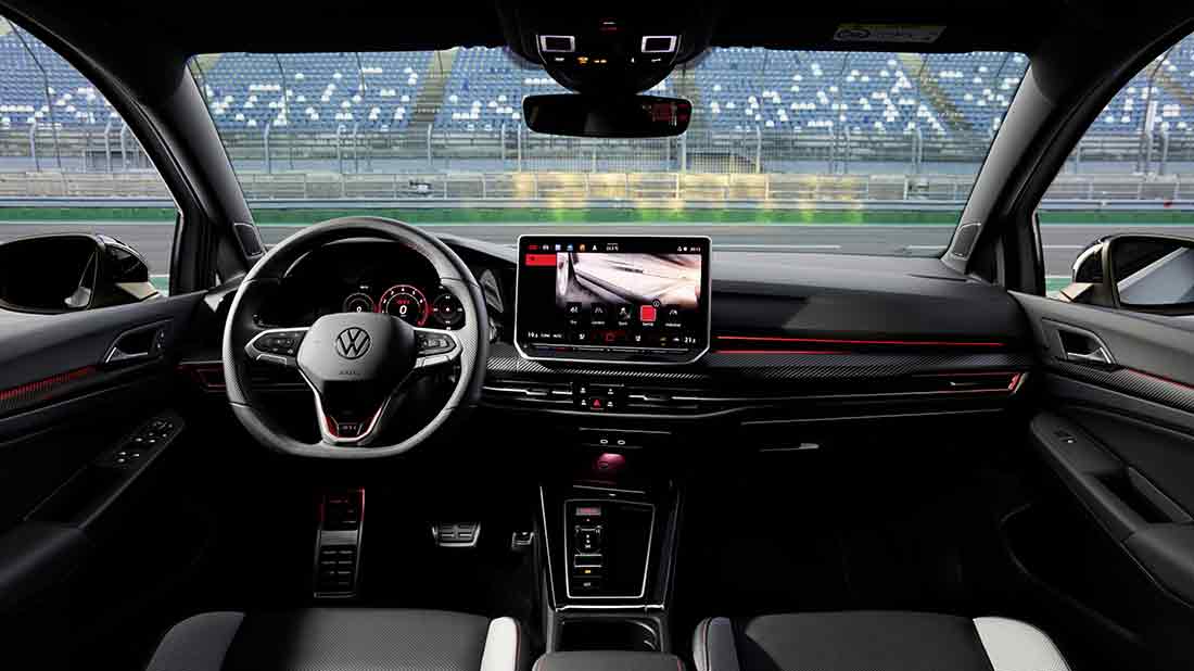 Gli interni della Golf GTI sono caratterizzati di serie da sedili sportivi top di gamma con poggiatesta integrati e un motivo a quadri tipico della GTI (Scalepaper) con cuciture rosse inserite nella scacchiera in grigio e nero. Il volante sportivo di entrambe le versioni GTI presenta inserti in pelle traforata antiscivolo nelle posizioni a ore 9 e a ore 3. Mentre la placchetta del volante a ore 6 è personalizzata dalla scritta GTI e da un’applicazione in rosso. Le levette del cambio al volante facilitano gli interventi manuali sul cambio a doppia frizione a 7 marce DSG, altrimenti automatico. L’equipaggiamento di serie prevede i pedali in acciaio inossidabile spazzolato e il padiglione nero. Gli interni della nuova Golf GTI Clubsport differiscono dalla GTI da 265 CV per i sedili sportivi top di gamma in ArtVelours di serie, un materiale raffinato e robusto utilizzato anche per gli inserti delle porte. Per entrambe le Golf GTI saranno disponibili a richiesta interni in pelle e la climatizzazione del sedile (riscaldamento e ventilazione). Inoltre, sempre a richiesta, saranno disponibili anche qui decorazioni dell’abitacolo in carbonio.
