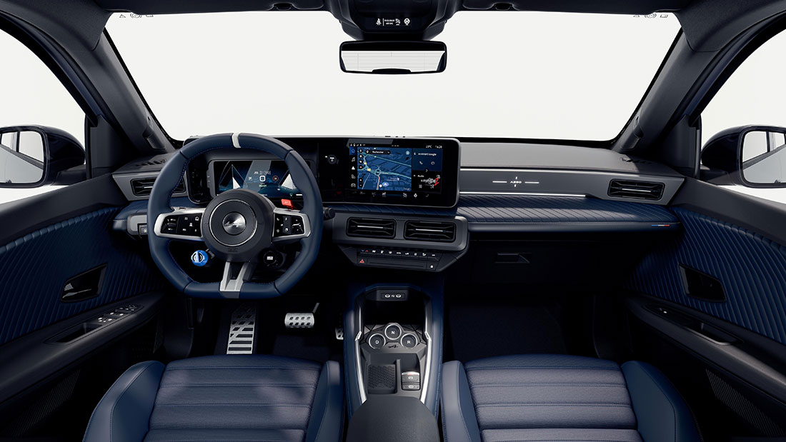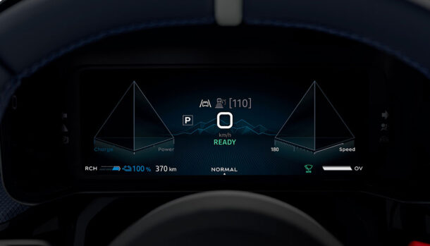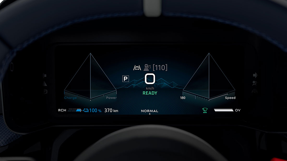 Di fronte al conducente, gli strumenti si distinguono per i codici grafici che si discostano dai classici contachilometri rotondi, optando piuttosto per temi dalle forme triangolari con una struttura cablata. Si tratta di un simbolo geometrico preciso, che permette di visualizzare con grande leggibilità il livello di potenza erogata o di ricarica sulla sinistra e la velocità sulla destra, compresa una linea rossa che indica i limiti di velocità segnalati dal sistema di rilevamento della segnaletica stradale. Il livello di rigenerazione è visibile nella parte inferiore del display. Il nuovo font di visualizzazione della velocità, nitido e arrotondato, spicca su uno sfondo blu dove si vedono le sagome delle montagne: uno dei tratti distintivi di Alpine.