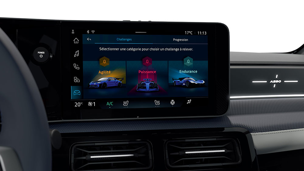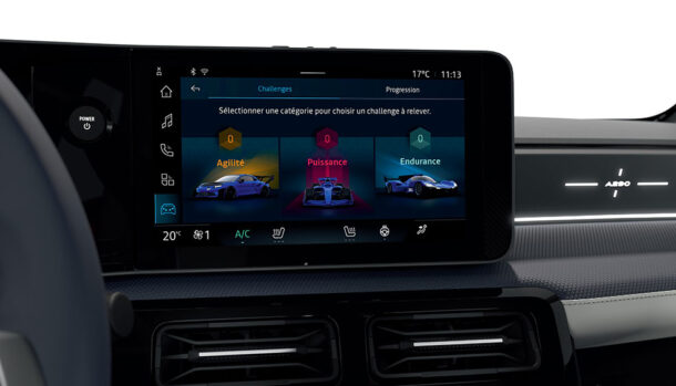 La potenza di rigenerazione ha quattro livelli regolabili dal volante con il pulsante RCH (che sta per Recharge). La prima posizione lascia l’auto completamente in modalità veleggio, il livello 1 corrisponde ad un freno motore simile a quello di A110, mentre i livelli 2 e 3 aumentano progressivamente la frenata rigenerativa, consentendo al conducente di scegliere la modalità di rigenerazione più adatta al proprio gusto, stile di guida e condizioni di circolazione.