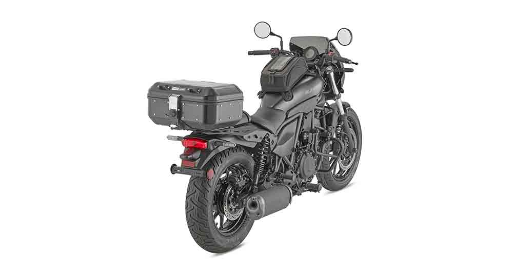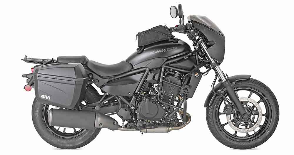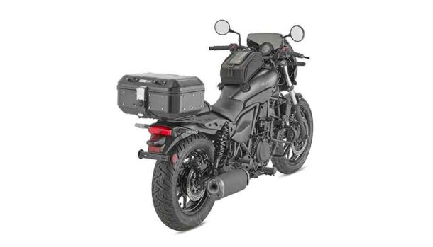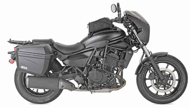 Una cruiser di media cilindrata, facile da guidare e da personalizzare. Forte di un look grintoso total black mantiene alcuni elementi “da cruiser“ come il sellino passeggero minimal, le pedane avanzate, il faro tondo, lo scarico e il baricentro bassi. Belli i doppi ammortizzatori posteriori che ricordano lo stile delle moto anticonformiste di Kawasaki. Con i suoi 735 mm, l’altezza della sella dell’Eliminator è la più bassa tra i modelli da 250-500cc di Kawasaki per uso stradale, contribuendo a garantire una rassicurante distanza da terra. La scelta tra sella alta e bassa consentono a un’ampia gamma di motociclisti di godersi l’Eliminator in tutta sicurezza e comodità. Il design è stato studiato per esaltare le peculiarità del modello. Il fanale posteriore a LED evoca lo stile dell’Eliminator originale, mentre il design della coda è originale. Sottile, con la sua parte inferiore tagliata a fendente che si inclina bruscamente verso l’alto, conferendo un’immagine dinamica. L’allestimento proposto da GIVI non solo esalta il design originale della moto, ma la trasforma anche in una compagna perfetta per il touring, grazie alla sua eccezionale maneggevolezza, accessibile anche a chi ha la patente A2, e al suo peso contenuto (176 kg in ordine di marcia).