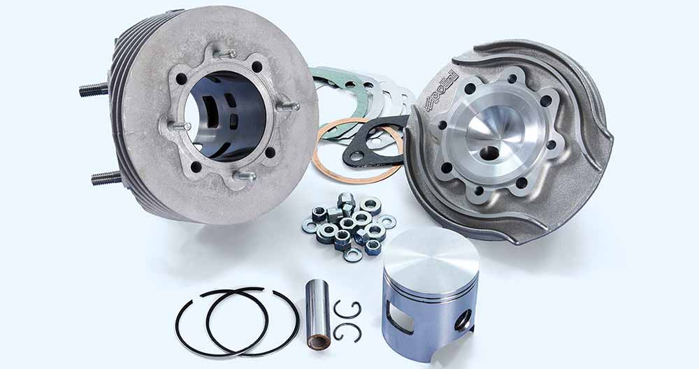 Il cilindro è fuso in alluminio, con alesaggio ø 58mm. per una cilindrata di 135cc. La canna con riporto Nikel-Silicio migliora lo scorrimento del pistone, la resistenza all’usura e all’abrasione. Il diagramma di distribuzione è “racing”. Il pistone forgiato è provvisto di due segmenti in ghisa S10 cromati. La testa è fusa in un unico pezzo e per aumentare la dissipazione del calore sono state create delle alette aggiuntive anche sotto il piano della testa. Il rapporto di compressione è stato disegnato per ottenere il massimo della prestazione.