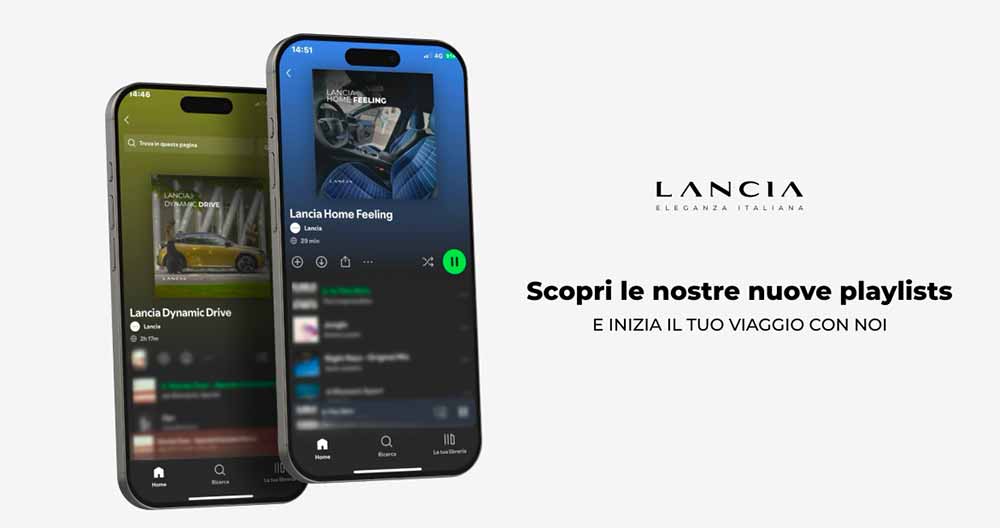 Spotify Lancia è on air da oggi con due playlist create ad hoc, Lancia Home Feeling e Lancia Dynamic Drive, la prima composta da tracce musicali più rilassanti, mentre la seconda da brani più energici e dinamici. Una dualità che vuole riflettere la doppia anima del marchio Lancia, elegante e radicale. Da un lato, la bellezza senza tempo di modelli come Aurelia, Flaminia e Fulvia, in un perfetto abbinamento tra forme pulite e volumi equilibrati. Dall’altro, un design “brutale” composto da forme geometriche primarie al servizio della massima resa prestazionale per modelli come Stratos, Rally 037 e Delta. Le due playlist Lancia, fruibili anche attraverso Android Auto ed Apple CarPlay, verranno periodicamente aggiornate. Con brani in linea con i valori del marchio e che rispecchino il carattere del cliente di Nuova Lancia Ypsilon. I clienti della vettura sono infatti interessati allo stile e all’innovazione tecnologica, attenti alle tematiche ambientali e sensibili alle mode, un pubblico dotato di spiccata sensibilità e naturalmente educato alla cultura, all’eleganza e all’armonia estetica.