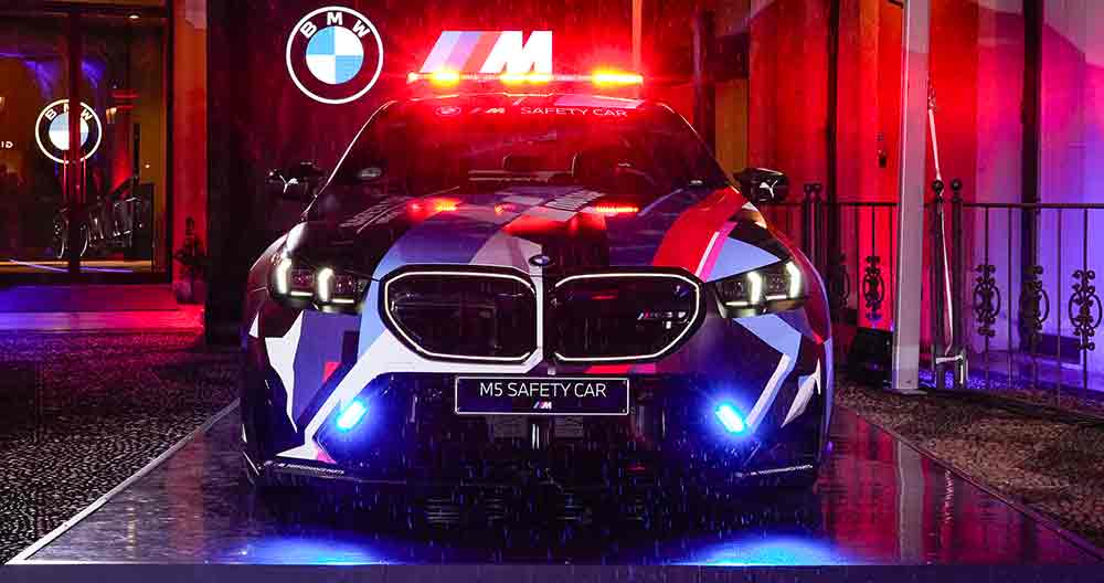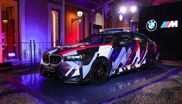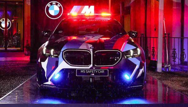 La nuova safety car è basata sulla BMW M5 presentata in anteprima mondiale a luglio al Goodwood Festival of Speed. Il lancio è previsto per novembre 2024. Questo modello di classe superiore a trazione elettrificata è perfettamente adatto all’uso come safety car. Sotto il cofano, una versione specifica del sistema M HYBRID combina un motore V8 ad alte prestazioni con tecnologia M TwinPower Turbo. Presente anche un motore elettrico che fornisce una potenza massima di 727 CV. Il cambio è un M Steptronic a 8 rapporti. La trazione integrale M xDrive. Numerose altre tecnologie M garantiscono una dinamica di guida perfetta in ogni situazione. Non solo tecnologia ma anche design. La sagome tipica delle BMW M ad alte prestazioni è stata reinterpretata, con ampi passaruota e minigonne laterali, una grembialatura anteriore scolpita e un design delle superfici specifico del modello nell’area del montante C che conferisce alla BMW M5 un aspetto atletico. La BMW M5 Safety Car per la MotoGP™ presenta anche una speciale livrea con design ispirato ai graffiti.