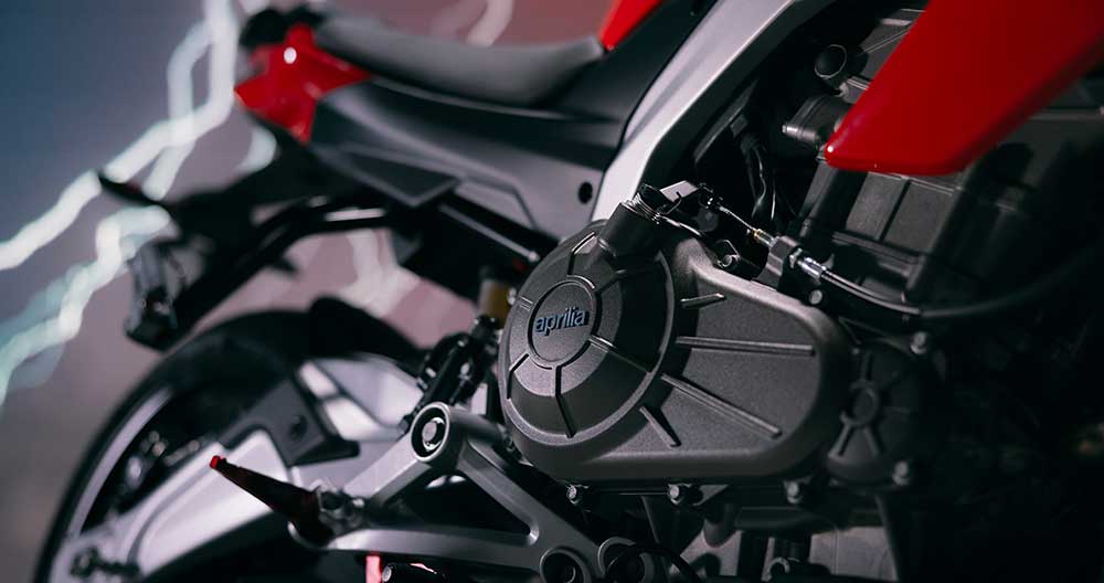 Tuono 457 nasce attorno al modernissimo motore bicilindrico di 457 cc appena introdotto su RS 457. Si tratta di un bicilindrico parallelo frontemarcia raffreddato a liquido con distribuzione a doppio albero a camme e quattro valvole per cilindro. La potenza massima è di 35 kW (47,6 CV) a 9.400 giri/minuto, il massimo possibile per una moto guidabile con patente A2. Questo propulsore di ultima generazione, estremamente compatto e leggero, contribuisce inoltre ad ottenere un rapporto peso/potenza da record, obiettivo prioritario dei progettisti di Noale. La frizione multidisco in bagno d’olio è servoassistita e dispone di sistema antisaltellamento. A differenza di RS 457, la trasmissione finale di Tuono 457 è più corta per via dell’adozione di una corona con un dente in più, ottenendo così ancora più prontezza a ogni tocco dell’acceleratore elettronico Ride-by-Wire multimappa.