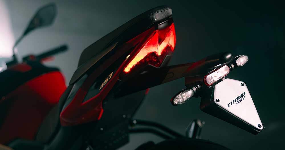 Tutto il design di Tuono 457 è una novità. Il nuovo serbatoio ha forme che trasmettono sportività. L’ergonomia è studiata appositamente per abbinarsi all’ampio manubrio, a vantaggio di una guida dinamica e divertente. Inedito è anche il design dei fianchetti e del codino, in linea con lo stile essenziale di Tuono 457. Il gruppo ottico posteriore è anch’esso full LED. Il motore bicilindrico con funzione portante è volutamente lasciato scoperto. La sella, dall’altezza da terra contenuta a 800 mm, è rastremata ai lati per favorire l’appoggio dei piedi a terra; al passeggero è dedicata una seduta generosa, mentre il codino monoposto è disponibile come accessorio.
