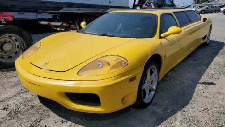 Dalla livrea del classico giallo Ferrari, in realtà dell’originale ha poco. Aprendo le portiere troviamo infatti l’interno arredamento di una limo, a partire dalle luci, per finire allo schermo tv e alla disposizione dei sedili. Ciò che invece non è stato toccato è il propulsore. Si tratta di un 3.6 litri V8 aspirato, capace di sprigionare fino a 394 cv, per una coppia massima di 373 Nm. Alle sue spalle poco meno di 60mila, niente se si pensa che ha circolato negli States.